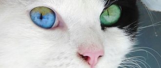 The manifestation of heterochromia is also a sure sign of purebred breeding. With different colors of the iris, one eye is blue, the other is usually green or yellow.