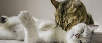 Usually, the animal also signals that it is hungry by jumping and clinging to clothes with its claws. The problem can be solved simply by feeding the pet. By the way, with a dissatisfied meow, he can “say” that he doesn’t like the food. Excitement. Moving, having a new pet in the house, or loud noises from the street can cause stress in the animal. Some cats lie in one place for a long time and breathe with effort, while others cannot hide their panic and scream loudly. In such cases, it is important to pay attention to the cat, caress your tailed friend once again, and give him a treat. If the situation does not return to normal, the help of a veterinarian will be required. Love. When ready to mate (estrus), cats will run and cry for a long time and uncontrollably. The “song” will be dominated by low and velvety rumbling notes. Additional indicators include rolling on the floor and rubbing against furniture. The problem can only be solved by selecting a partner, since both admonitions and punishment are powerless in the case of hormonal changes. The only solution is special drops. If the animal is not planned to be used for breeding, the cat can be sterilized, and the female cat can be neutered. Showing tenderness. By meowing, the cat tries once again to remind him of how much he loves his owner and how dear he is to him. Disease. Malaise can be caused not only by injury, but also by internal pathologies. If the scream becomes louder, you should not hesitate to go to the veterinary clinic. Excess adrenaline. During active games and pranks, the cat can forget itself and demonstrate its fighting spirit in such an accessible way. Conversation with relatives. A fairly common opinion among felinologists is that cats communicate only with people through sounds. But that's not true. Cats use meowing when interacting with their relatives to express their own emotions and scare away potential enemies.