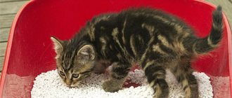 If your pet meows and shows restlessness on the tray, it is unacceptable to leave the situation unattended. To exclude possible pathologies, you should contact a veterinarian; and also from the breeder, when purchasing a kitten, you should always find out whether he is accustomed to different foods or still eats only mother’s milk.