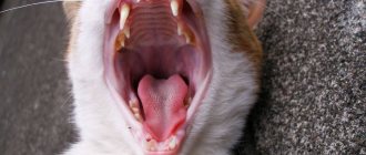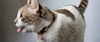 Another threatening pathology of the respiratory system is asthma. The cat experiences attacks of suffocation, accompanied by characteristic sounds. A cough may occur, which, due to spasms, causes a gag reflex. Later shortness of breath, apathy and poor appetite appear. The first stage of asthma (moderate) may remain unrecognized by the owner for a long time. The cat periodically coughs and snores at night, but overall remains in good health. With a suffocating cough, respiratory failure develops - at this stage the animal must be urgently taken to the veterinarian.